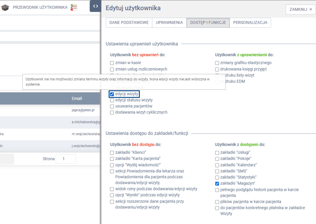 W panelu bocznym wysuwanym wybierz zakładkę DOSTĘP I FUNKCJE, a następnie w sekcji “Ustawienia uprawnień użytkownika”, kolumnie “Użytkownik bez uprawnień do:” zaznacz checkbox: “edycji wizyty”.