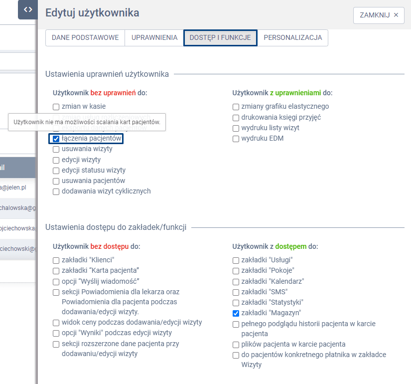 W panelu bocznym wysuwanym wybierz zakładkę DOSTĘP I FUNKCJE, a następnie w sekcji “Ustawienia uprawnień użytkownika”, kolumnie “Użytkownik bez dostępu do:“ zaznacz checkbox “łączenia pacjentów”.