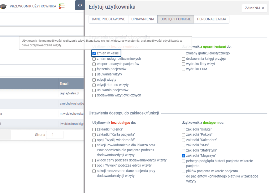 W panelu bocznym wysuwanym wybierz zakładkę DOSTĘP I FUNKCJE, a następnie w sekcji “Ustawienia uprawnień użytkownika”, kolumnie “Użytkownik bez uprawnień do:” zaznacz checkbox: “zmian w kasie”.