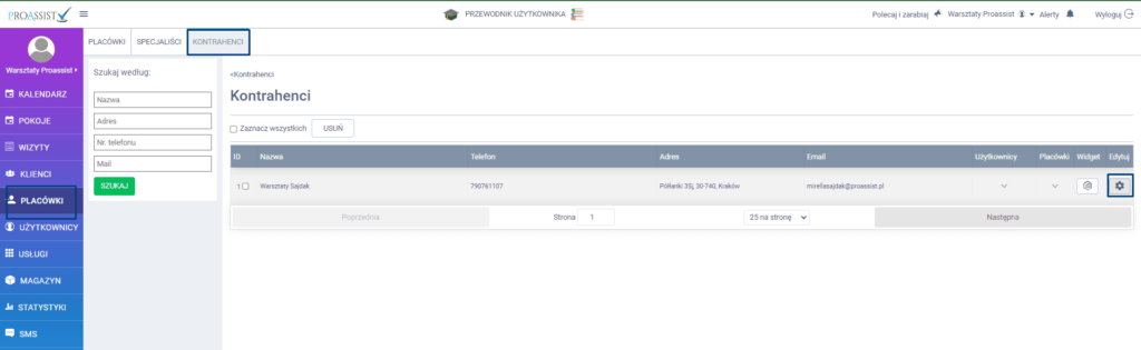 By móc rozpocząć zapisywanie pacjentów z uwzględnieniem konkretnego pokoju,, kliknij z bocznego menu w zakładkę PLACÓWKI -> KONTRAHENCI -> ikona edycji.