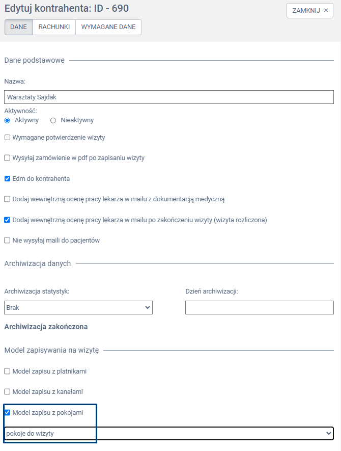 W panelu bocznym wysuwanym zaznacz checkbox: Model zapisu z pokojami, a następnie z selektu wybierz opcję pokoje do wizyt.