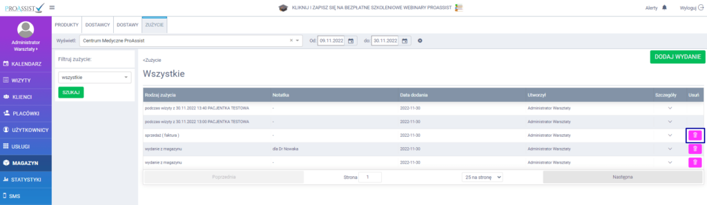 Uwaga: możesz usuwać zużycie w formie wydania z magazynu oraz sprzedaży. Nie da się usunąć zużycia, które było powiązane z daną wizytą.