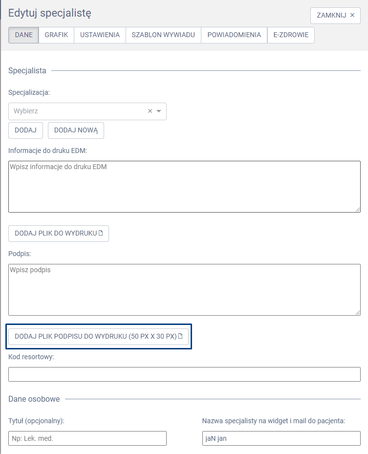 W oknie edycji specjalisty wgraj zdjęcie podpisu lub sygnaturę pieczątki klikając w zakładkę DODAJ PLIK PODPISU DO WYDRUKU.