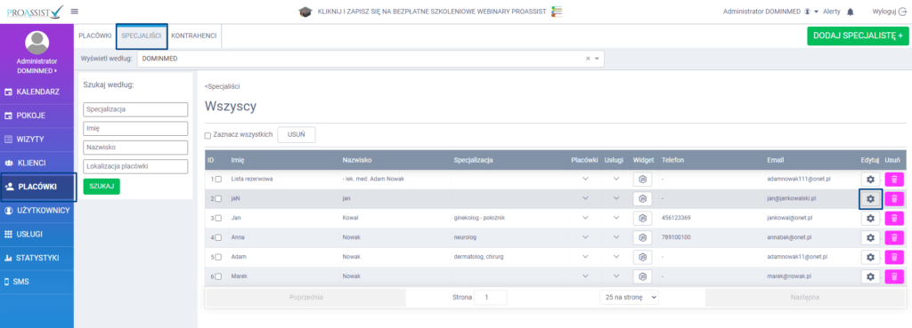 Na liście wszystkich specjalistów, kliknij w ikonę edycji przy konkretnym specjaliście.