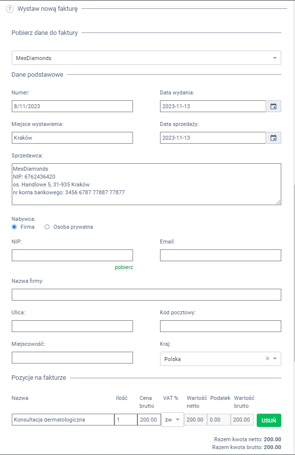 Dane sprzedawcy uzupełnione są automatycznie przez system na bazie konfiguracji modułu.