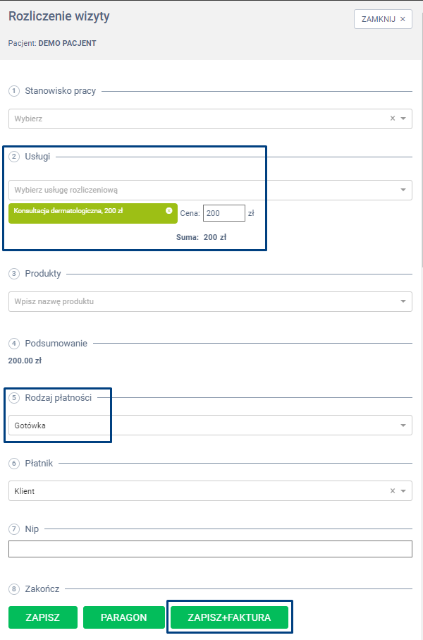 W oknie Rozliczenie wizyty określ usługę rozliczeniową, o ile nie została wybrana przez specjalistę w oknie przeprowadzania wizyty. Dodatkowo zaznacz formę płatności. W kolejnym kroku wybierz zieloną zakładkę ZAPISZ + FAKTURA.