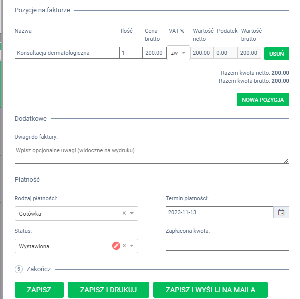 - ZAPISZ – faktura zostanie zapisana tylko w systemie