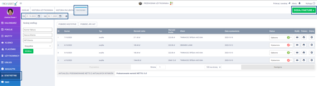 Jeśli chcesz wystawić Fakturę na usługi, które nie są powiązane z daną rezerwacją, np. Faktura za wynajem gabinetu, w tym celu z bocznego menu wybierz zakładkę STATYSTYKI. Z bocznego menu wybierz zakładkę RACHUNKI, a następnie określ zakres dat. W kolejnym kroku wybierz zakładkę DODAJ FAKTURĘ+