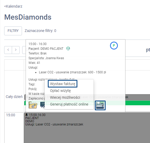 Jeżeli w Twojej placówce nie używasz usług rozliczeniowych i chcesz wystawić FV w tym celu najedź kursorem myszy na wizytę, a następnie w oknie informacyjnym do wizyty kliknij ikonkę kasy (ostatnia ikonka). Z menu wybierz Wystaw fakturę