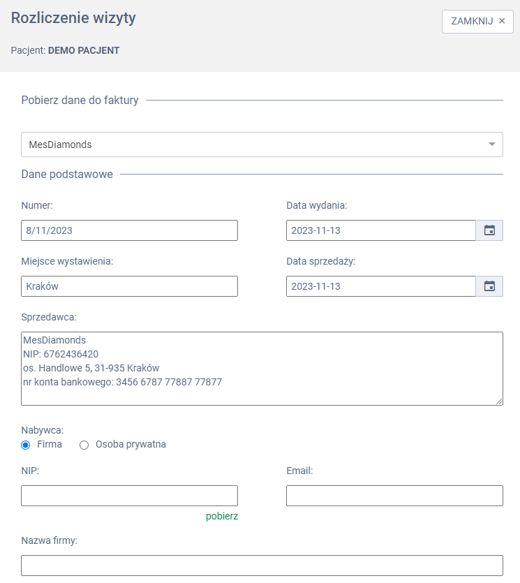 W oknie Rozliczenie wizyty określ Nabywcę – czy to ma być Faktura wystawiona na firmę czy na osobę prywatną.