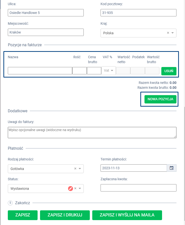 System automatycznie wylicza wartość netto oraz podatek. Możesz dodać do faktury więcej niż jedną pozycję, klikając przycisk NOWA POZYCJA.