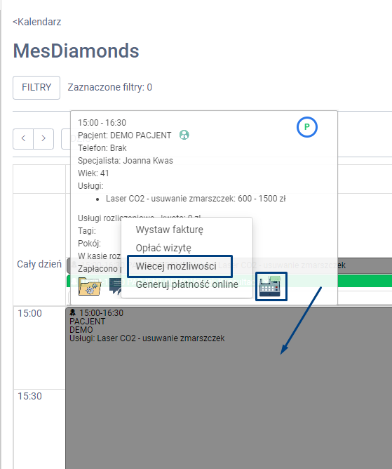 Aby wystawić FV tym sposobem, w tym celu najedź kursorem myszy na wizytę, a następnie w oknie informacyjnym do wizyty kliknij ikonkę kasy (ostatnia ikonka). Z menu wybierz Więcej możliwości.