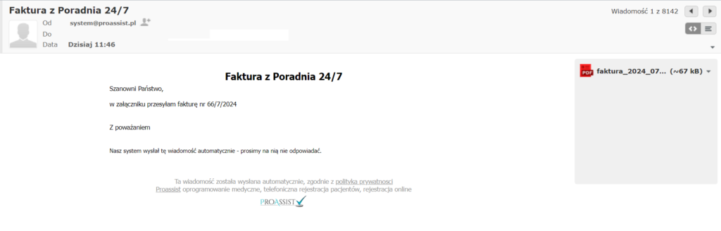 Przykładowa wiadomość email wysyłana z systemu Proassist z Fakturą: