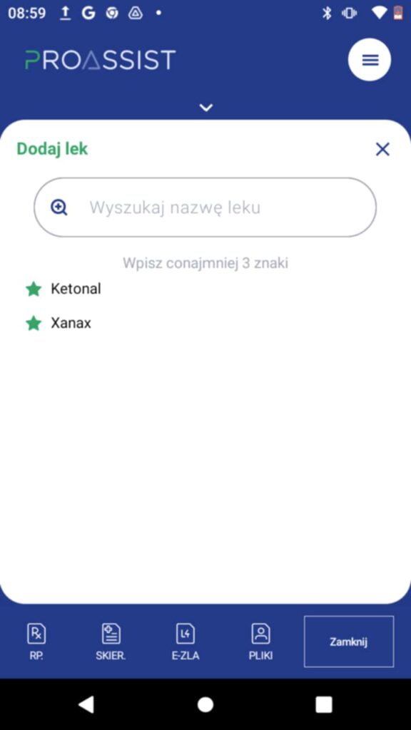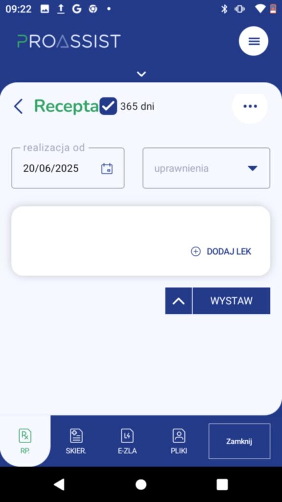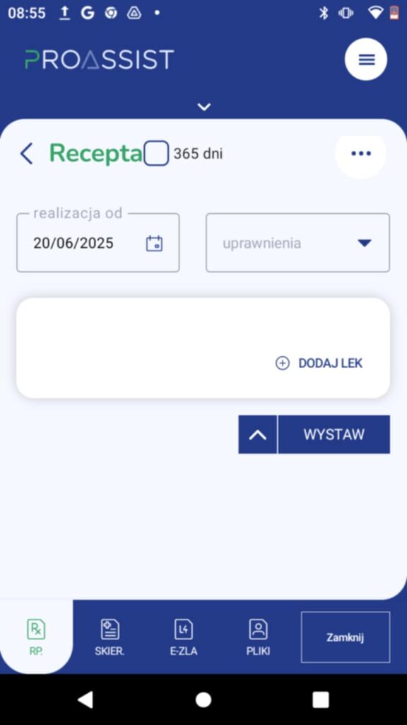 – lek, który przepisujesz pacjentowi. Aby wyszukać odpowiedniego leku, kliknij w opcję DODAJ LEK.