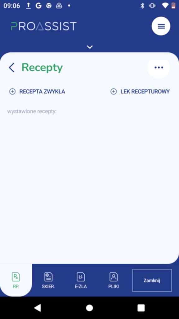 W oknie EDM w dolnym menu wybierz zakładkę RP. W nowym widoku zobaczysz historię recept wystawionych podczas tej wizyty. W kolejnym kroku zdefiniuj rodzaj recepty, czyli w tym przypadku LEK RECEPTUROWY.
