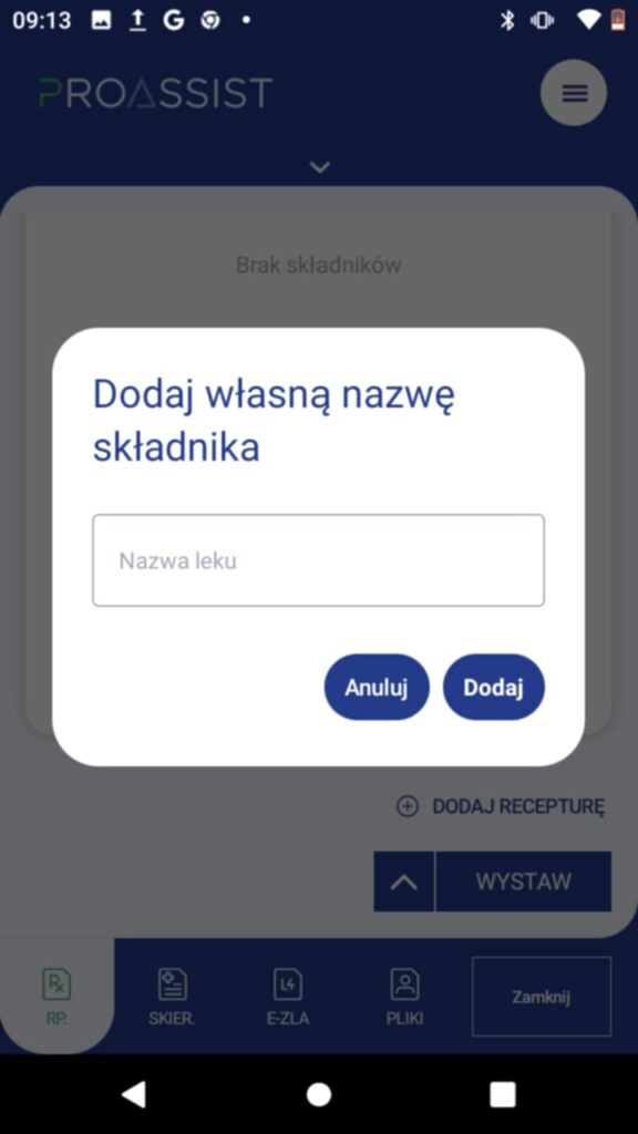 Wpisz nazwę własną leku i przejdź do tworzenia składowych recepty, korzystając z opcji: WYSZUKAJ I DODAJ SKŁADNIK LUB LEK.