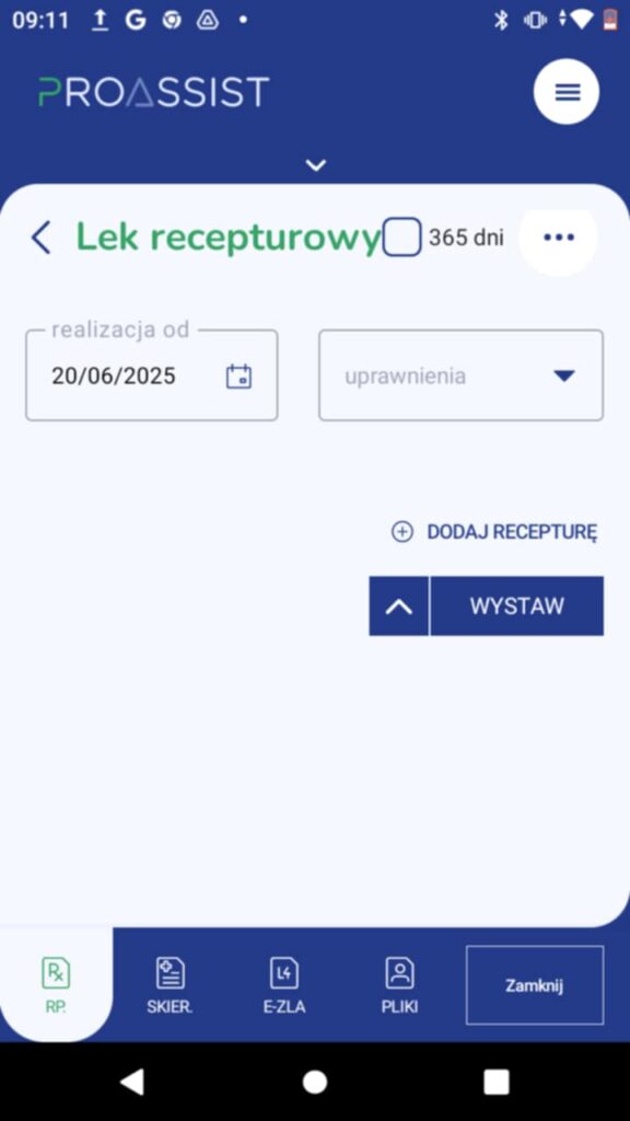– uprawnienia: wybierz z listy odpowiednie uprawnienia, jeśli wystawiasz receptę z refundacją