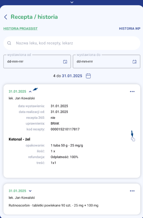 W kolejnym kroku rozwiń informacje dot. recepty za pomocą ikony v. Przy konkretnym leku kliknij w ikonę powielania.