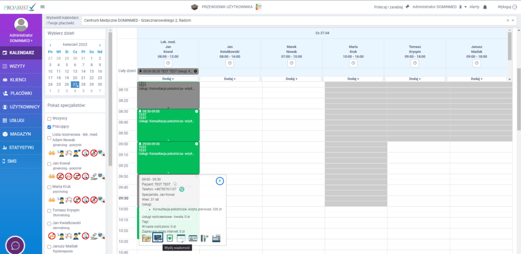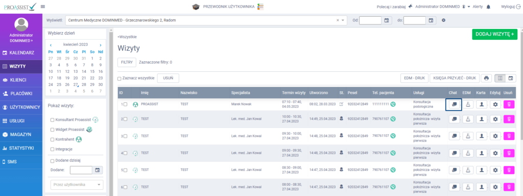 Aby wysłać MMS do pacjenta należy kliknąć w ikonę chatu, która jest dostępna zarówno z zakładki KALENDARZ – przy konkretnej rezerwacji