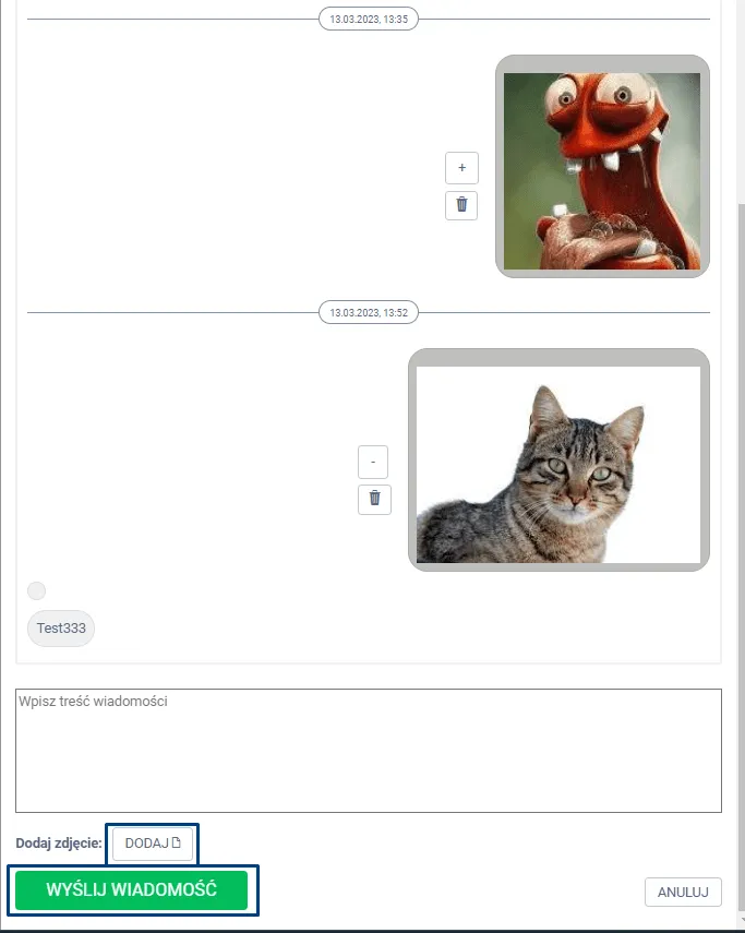 W nowym oknie kliknij w zakładkę DODAJ, możesz wprowadzić również treść. Aby wysłać wiadomość kliknij w zieloną zakładkę WYŚLIJ.