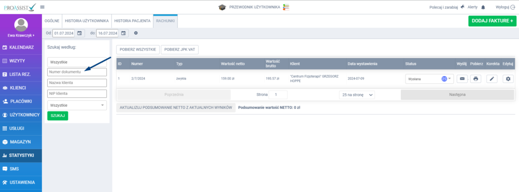 Jeżeli chcesz odnaleźć w systemie wystawioną Fakturę, bądź też korektę, w tym celu z bocznego menu przejdź do zakładki STATYSTYKI, a następnie wybierz RACHUNKI. Określ zakres dat. Możesz również skorzystać z wyszukiwarki określając: