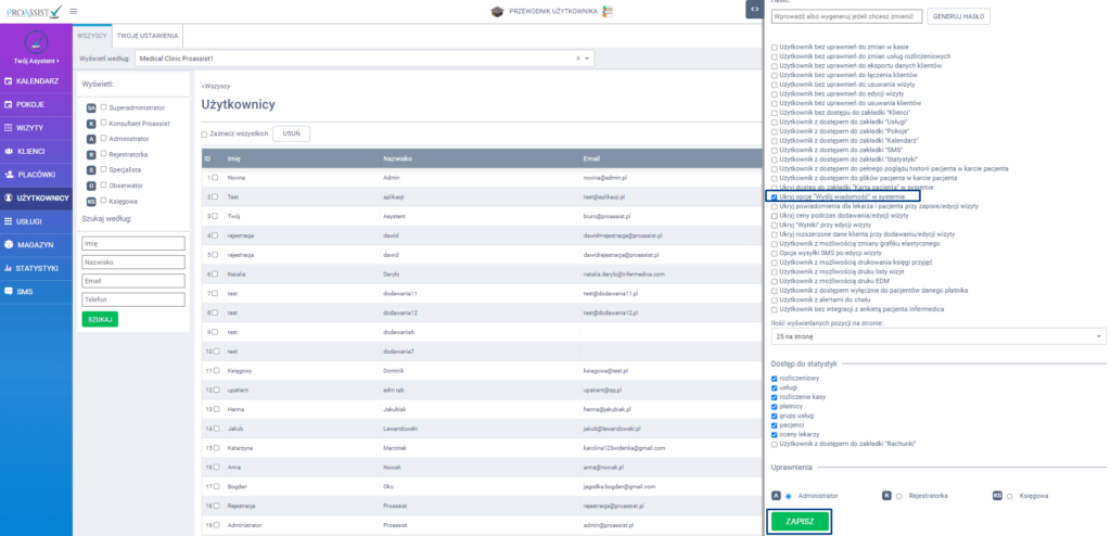 Jeżeli chcesz, aby użytkownik nie miał dostępu do zakładki “Wyślij wiadomość” w tym celu z bocznego menu kliknij w zakładkę UŻYTKOWNICY, następnie w ikonę edycji przy konkretnym użytkowniku. W panelu bocznym wysuwanym zaznacz checkbox “Ukryj opcję “Wyślij wiadomość” w systemie”.