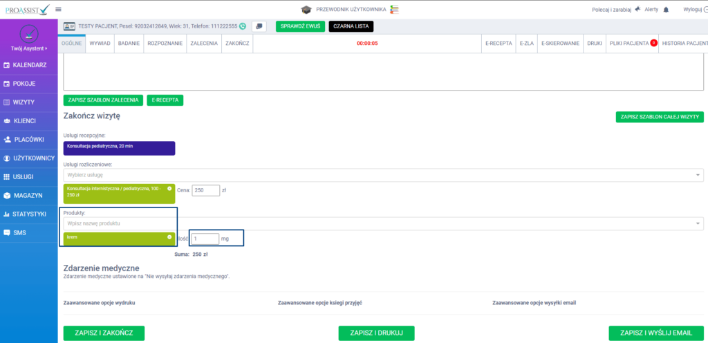 Specjalista może określić konkretną ilość zużytego preparatu w oknie przeprowadzania wizyty. W tym celu w sekcji Zakończ wizytę kliknij w selekt Produkty, a następnie wyszukaj odpowiedniego produktu z listy wpisując jego nazwę i kliknij Enter. W sekcji ilość możesz zarządzać ilością zużytego preparatu.