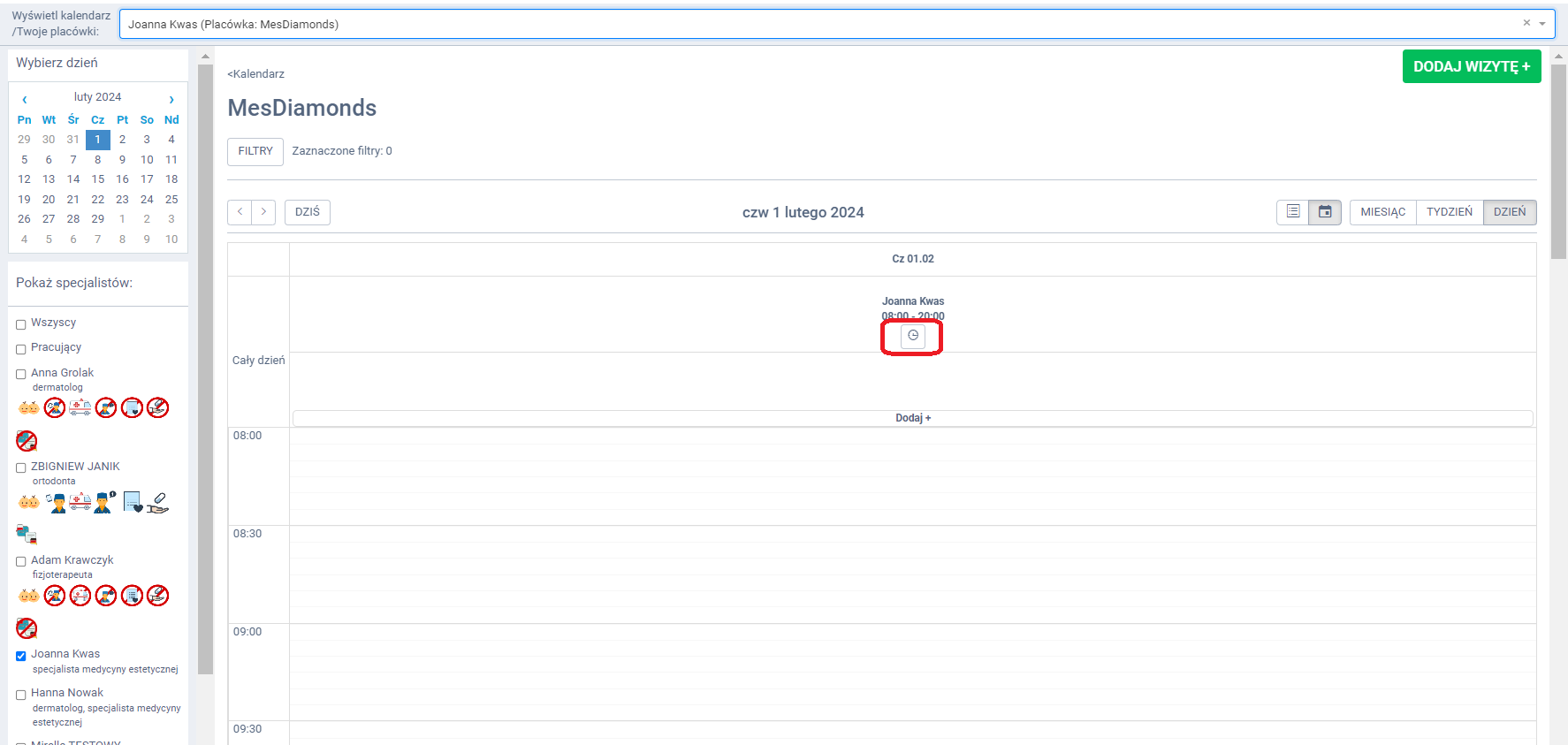 Aby oznaczyć dni, w których specjalista nie będzie przyjmował, w zakładce kalendarz wybierz dany dzień, który chcesz oznaczyć jako wyłączony z zapisów.