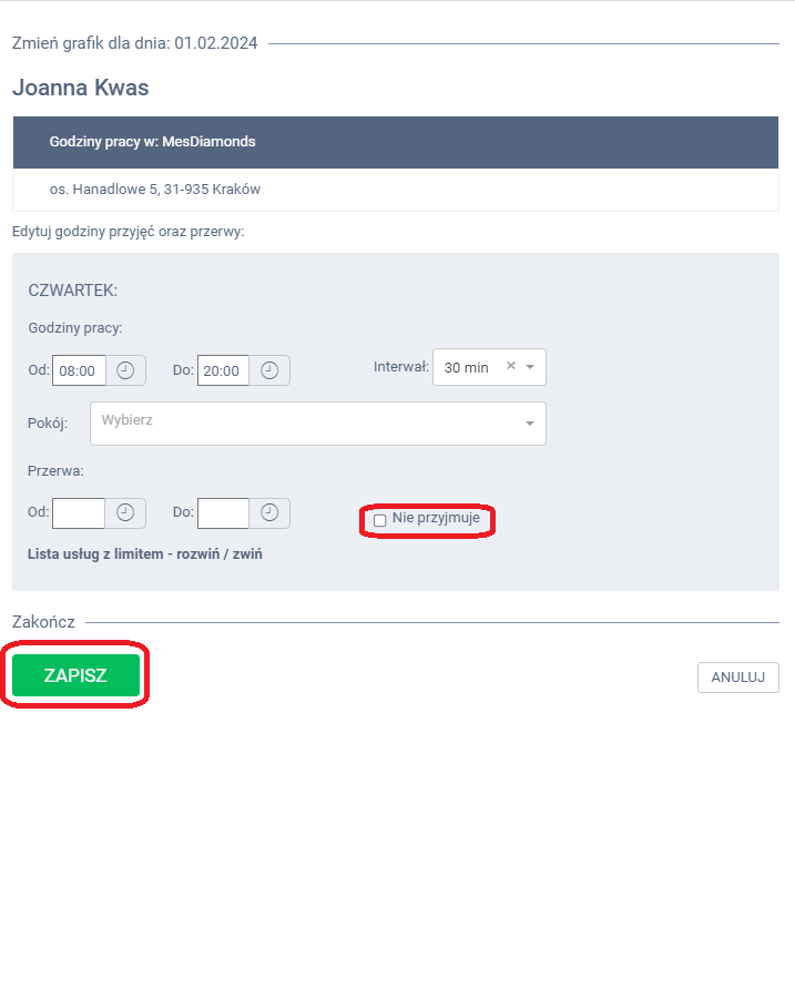 Wybierz ikonę zegara i w wysuwanym oknie wybierz checkbox „Nie przyjmuje„, następnie kliknij „ZAPISZ„