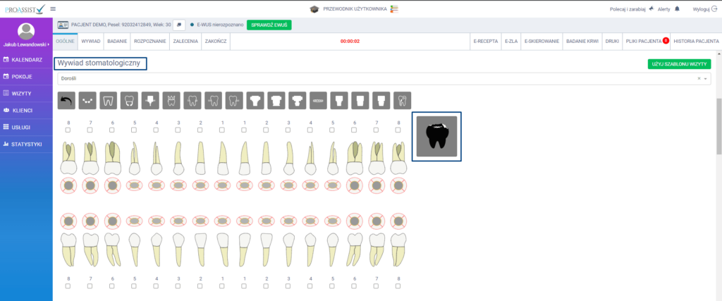Diagram zębowy może przedstawiać w formie graficznej choroby danych zębów za pomocą wybranych przez Ciebie kolorów. Każdy specjalista może tworzyć własne choroby uzębienia za pomocą kreatora chorób, który dostępny jest w oknie przeprowadzania wizyty, w sekcji wywiad stomatologiczny. W tym celu wystarczy kliknąć w ikonę “Zdefiniuj możliwe choroby”.