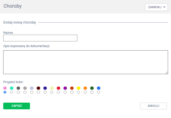 W kolejnym kroku określ nazwę choroby, opis, który będzie widoczny na dokumentacji medycznej oraz kolor jakim będa oznaczane choroby uzębiania na diagramie. Wprowadzone dane zatwierdź zieloną zakładką ZAPISZ.