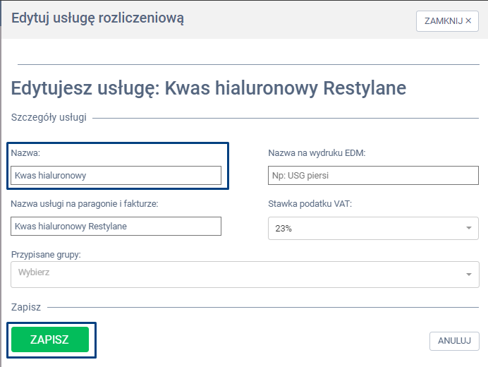 W panelu bocznym wysuwanym, właściwą nazwę usługi w sekcji „Nazwa”. Wprowadzone dane zatwierdź klikając w zieloną zakładkę ZAPISZ.