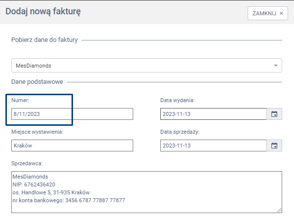 Jeżeli chcesz zmienić nr na fakturze, w tym celu w oknie wystawiania faktury dokonaj edycji numeru w sekcji Numer wpisując prawidłową wartość, aby zachować ciągłość numeracji.