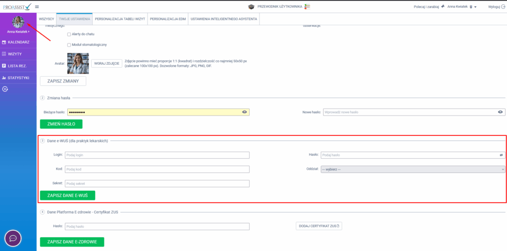 Jeżeli posiadasz dostęp do systemu z rolą specjalisty, kliknij w swój avatar, a następnie w oknie ustawień przejdź do punktu Dane e-WUŚ (dla praktyk lekarskich).