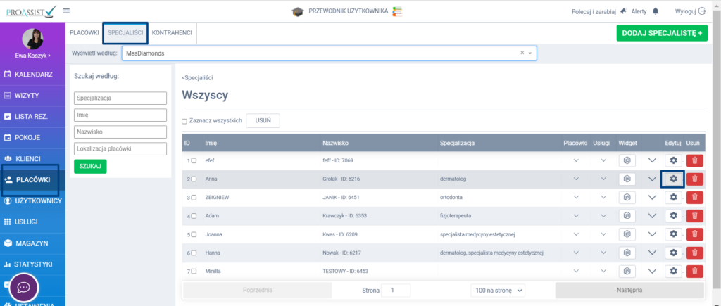 Jeżeli posiadasz dostęp do systemu z rolą administratora, z bocznego menu wybierz zakładkę PLACÓWKI, a następnie z górnego menu zakładkę SPECJALIŚCI. Przy konkretnym specjaliście kliknij w ikonę edycji.