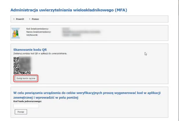 W tej zakładce zobaczysz kod QR potrzebny do konfiguracji MFA. Pod kodem QR znajduje się opcja: „Dodaj konto ręcznie” Kliknij ją.