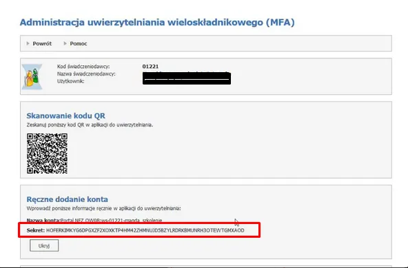 Jak pobrać Sekret MFA (TOTP) – Portal Świadczeniodawcy / Portal Personelu / SZOI #