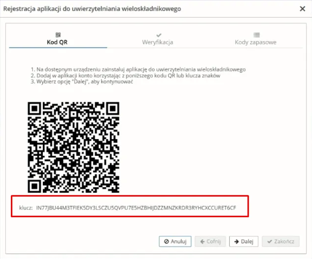 - Kliknij Dalej, wpisz wygenerowany kod i zakończ konfigurację.
