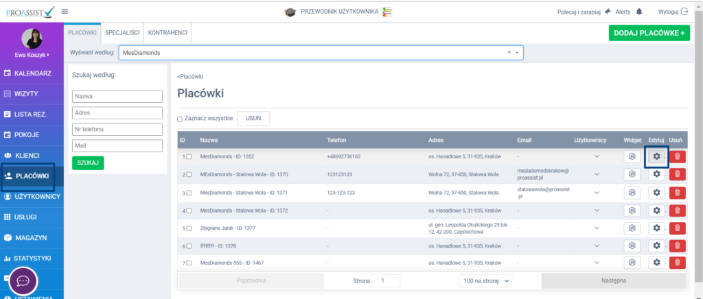 W tym celu Z bocznego menu wybierz zakładkę PLACÓWKI, a następnie przy nazwie placówki, kliknij w ikonę edycji.