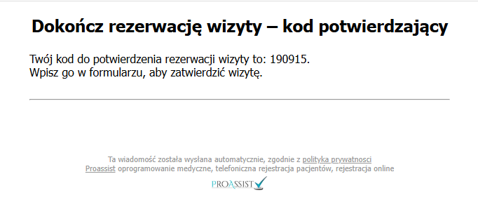 - Pacjent musi otworzyć wiadomość i wpisać ten kod do formularza rejestracji online, aby potwierdzić swoją tożsamość i dokończyć rezerwację wizyty.