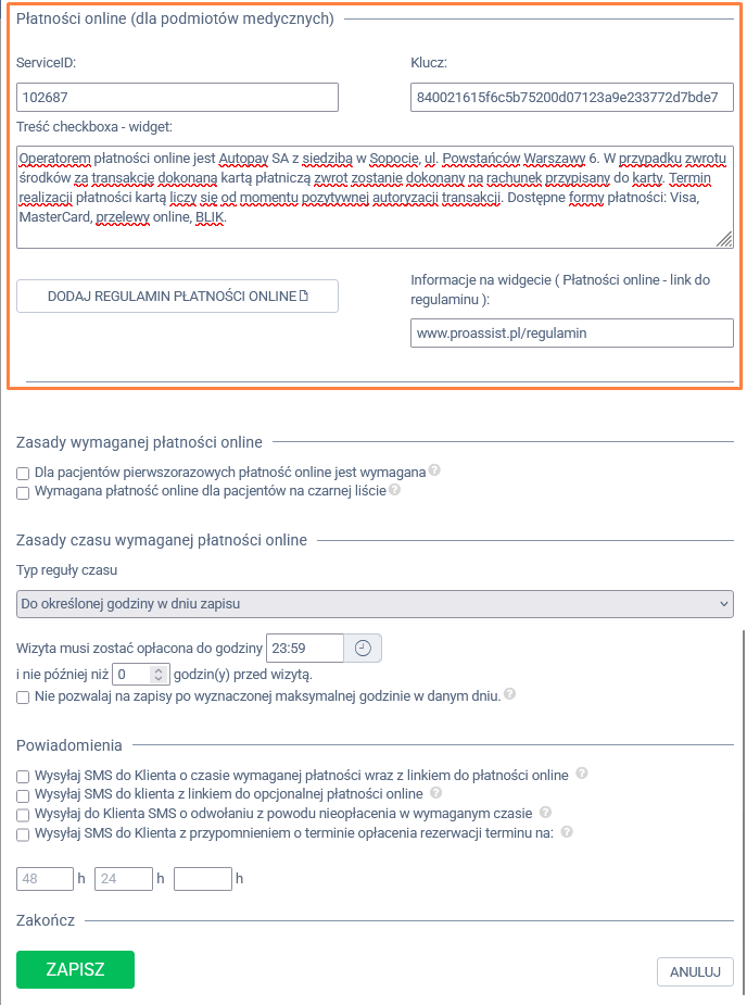 3. Po wprowadzeniu danych konta, kluczy i zasad płatności kliknij ZAPISZ, aby aktywować moduł oraz obowiązujące reguły dla pacjentów.