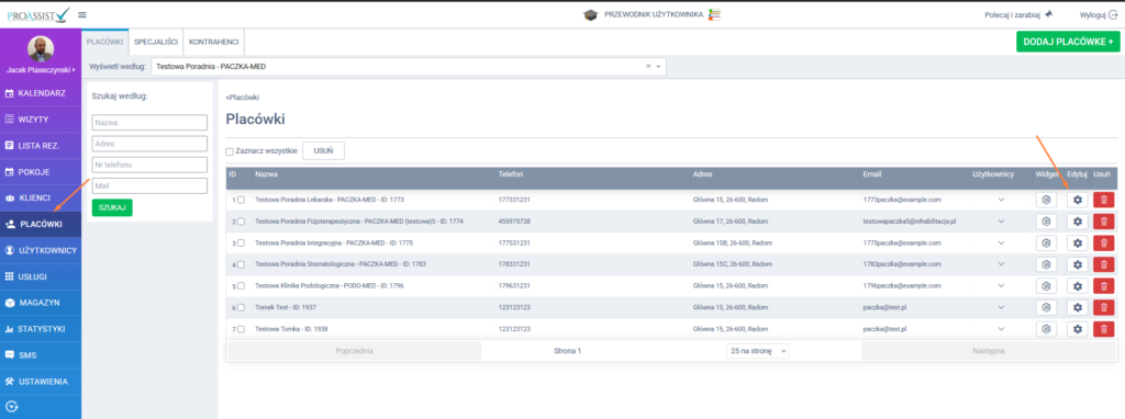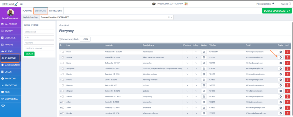 - W bocznym menu wybierz PLACÓWKI, a następnie SPECJALIŚCI.