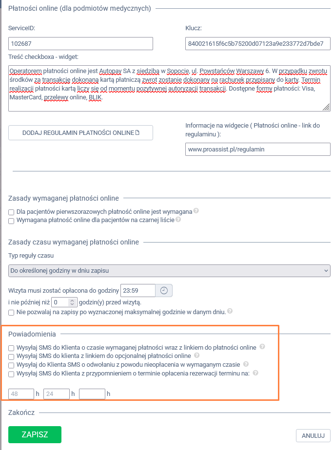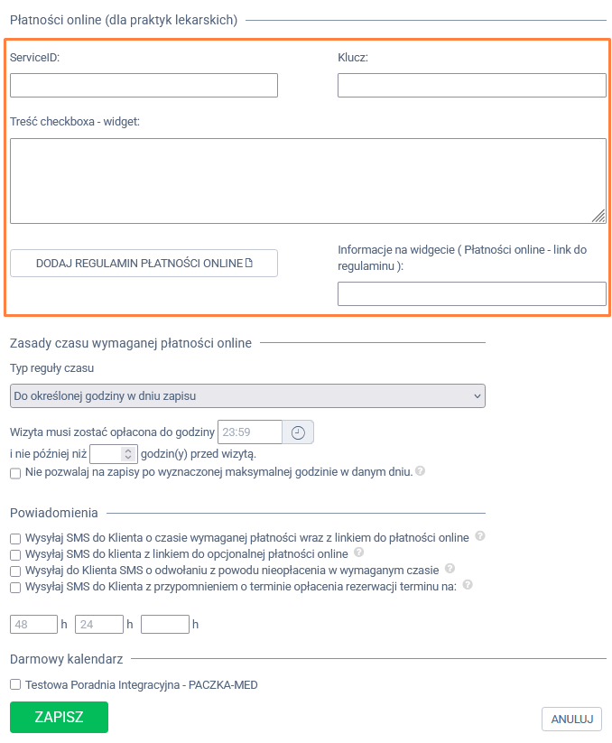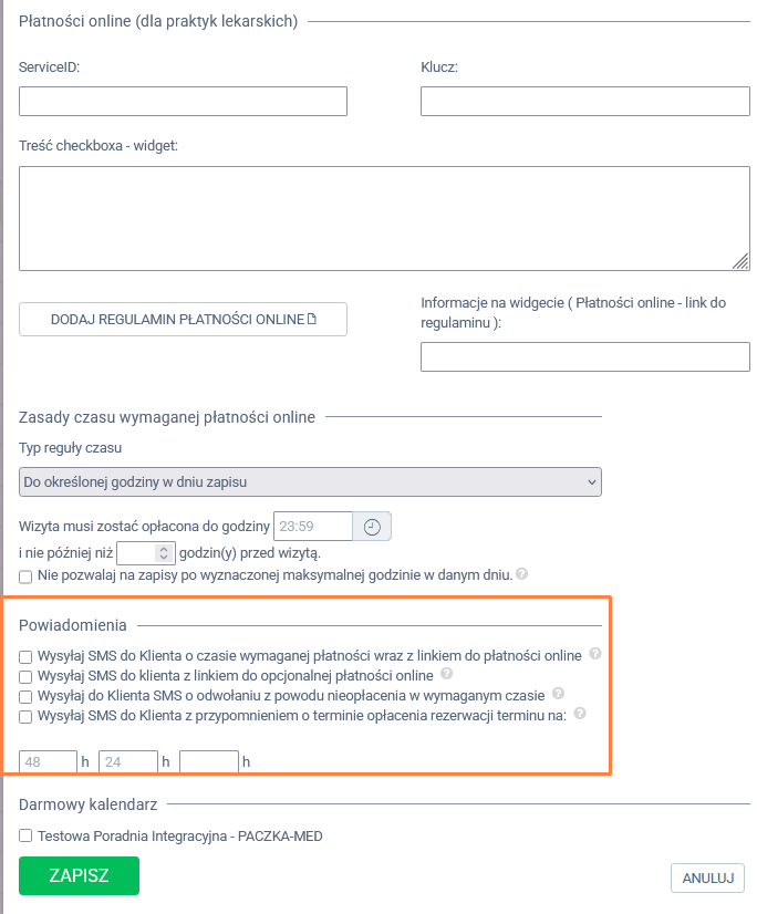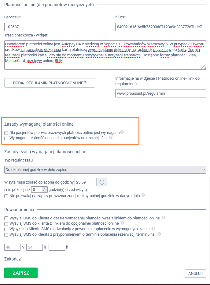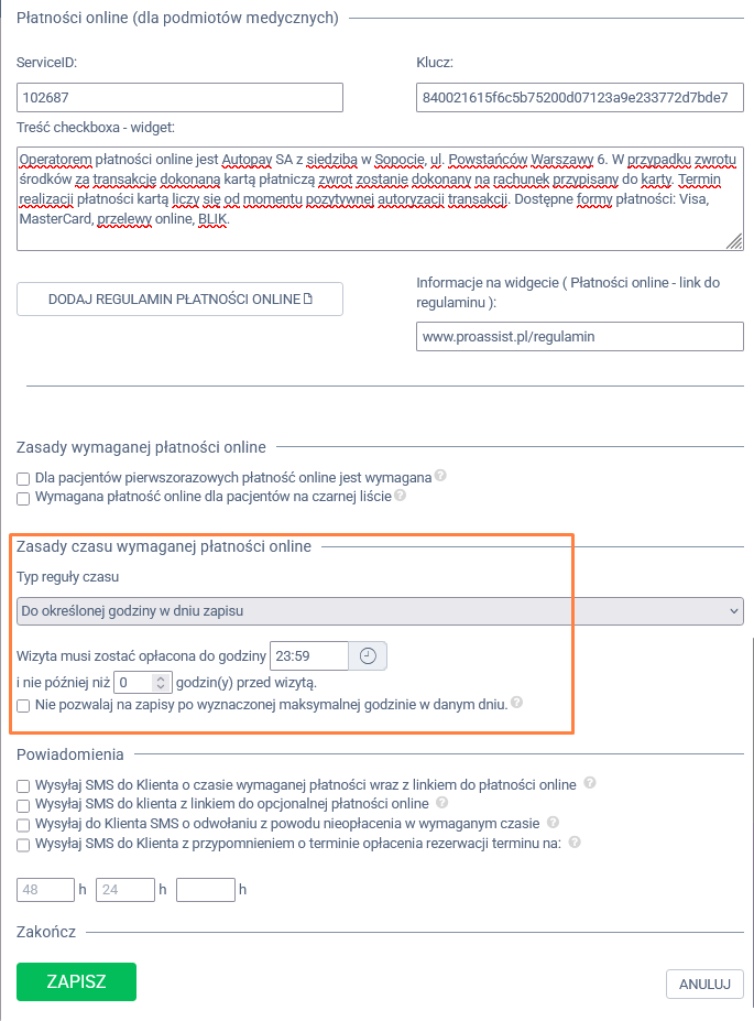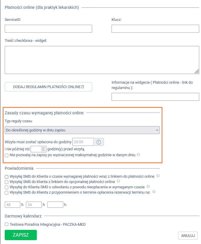 – Parametry wymagane do ustawienia: liczba godzin od momentu zapisu oraz maksymalna liczba godzin przed wizytą, do której płatność musi być dokonana.