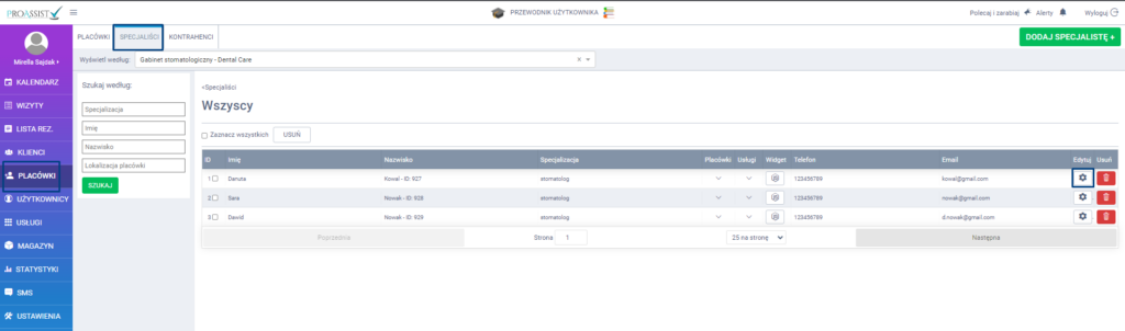 Jeżeli nie chcesz, aby zalecenia wraz z uzupełnionym diagramem zębowym były kopiowane do kolejnej wizyty pacjenta, możesz wyłączyć tę opcję w ustawieniach specjalisty. W tym celu z bocznego menu kliknij w zakładkę PLACÓWKI, z górnego menu SPECJALIŚCI. Przy konkretnym specjaliście dla którego chcesz włączyć takie ustawienia, kliknij w ikonę edycji.