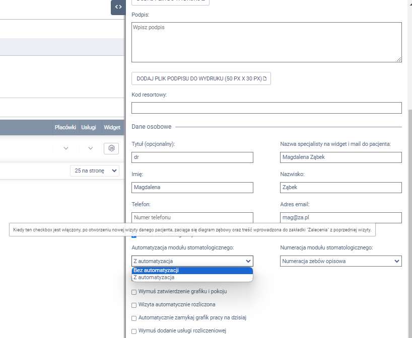 W panelu bocznym wysuwanym przy Module stomatologicznym, kliknij w selekt Z automatyzacją i wybierz opcję Bez automatyzacji.