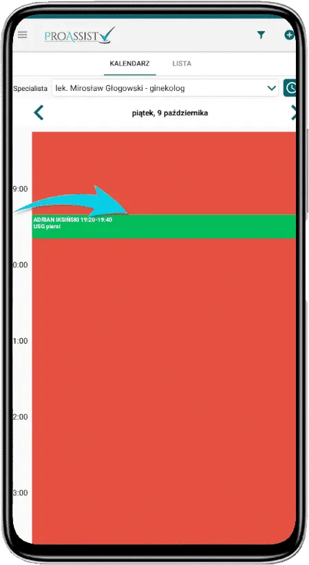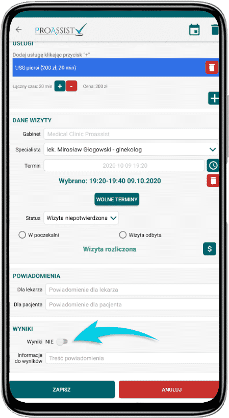 W aplikacji Proassist istnieje możliwość powiadomienia pacjenta o odebraniu wyników badań. Aby to zrobić należy wybrać konkretną wizytę z kalendarza, a następnie, na samym dole, w sekcji WYNIKI, zaznaczyć TAK. Wtedy do danego pacjenta zostanie wysłana wiadomość z informacją o odbiorze wyników badań. Poniżej znajduje się pole „Informacja do wyników”. Jest to miejsce na notatkę dotyczącą wyników badań, widoczną tylko dla lekarza.