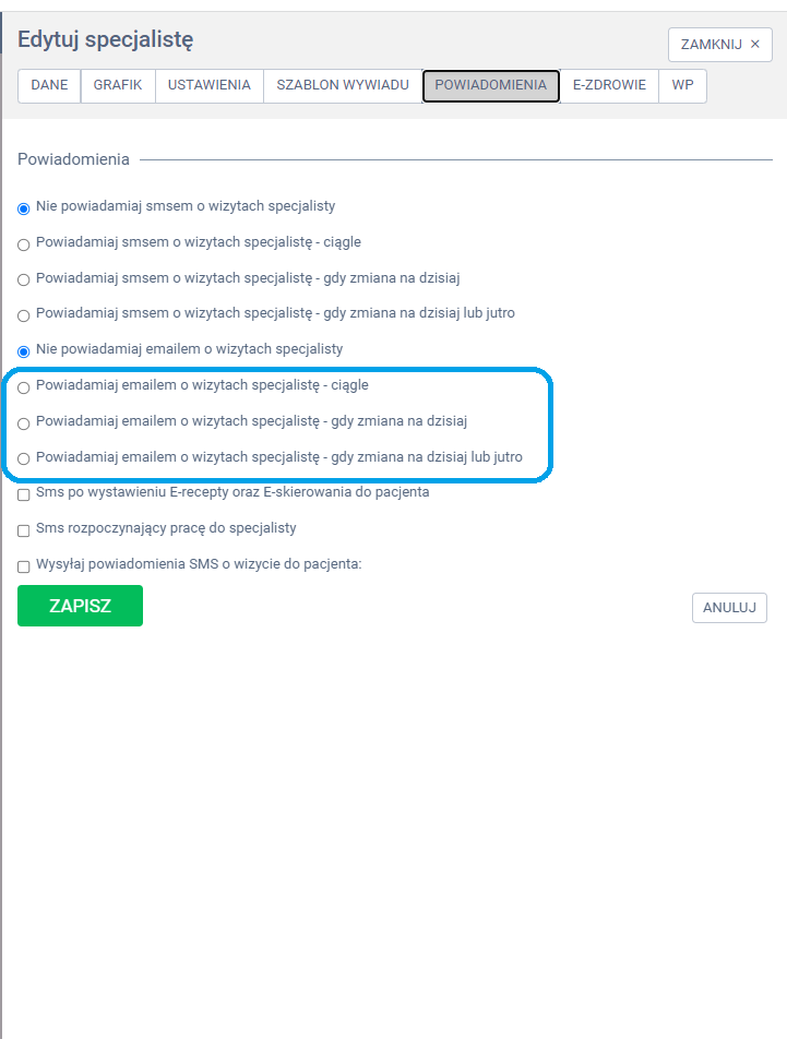 📩Powiadamiaj emailem o wizytach specjalistę – gdy zmiana na dzisiaj lub jutro – specjalista otrzymuje wiadomości email o dodaniu/przełożeniu/odwołaniu wizyt umówionych na dzisiaj i jutro.