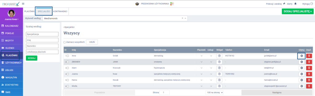 Aby włączyć tę opcję wysyłania wiadomości, wybierz z bocznego menu PLACÓWKI, a następnie z górnego menu okna SPECJALŚCI. Kliknij ikonę „Edytuj” przy danym specjaliście, którego smsy mają dotyczyć.