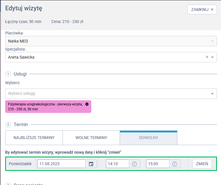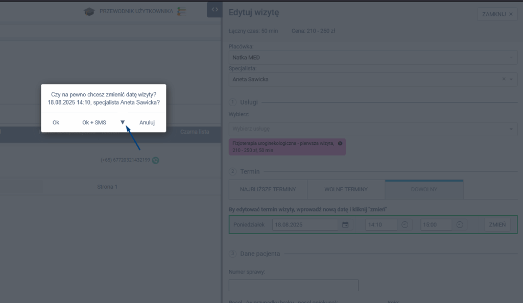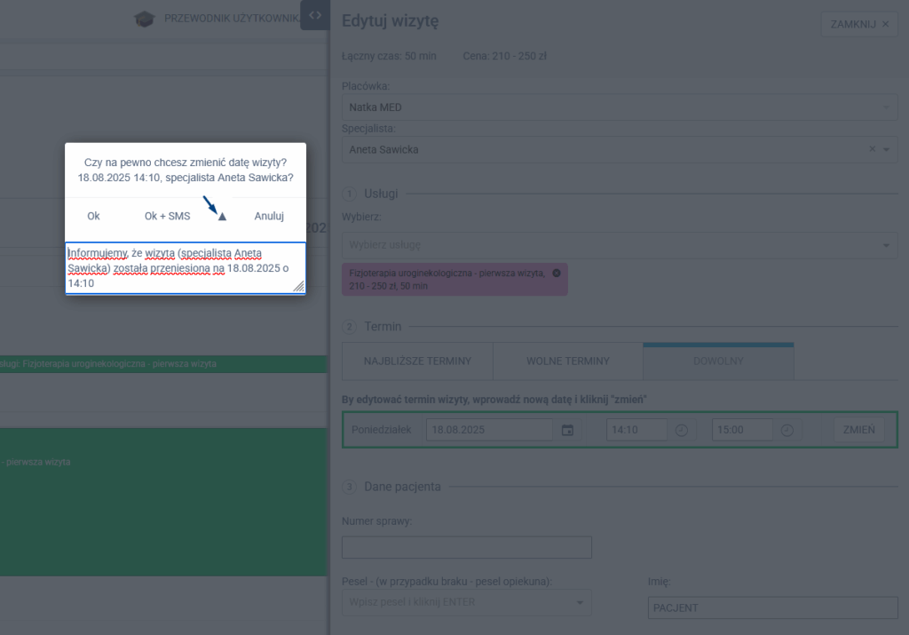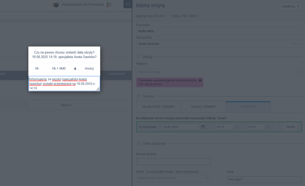 - OK + SMS – zatwierdza zmianę i wysyła SMS-a do pacjenta z informacją o nowym terminie wizyty.