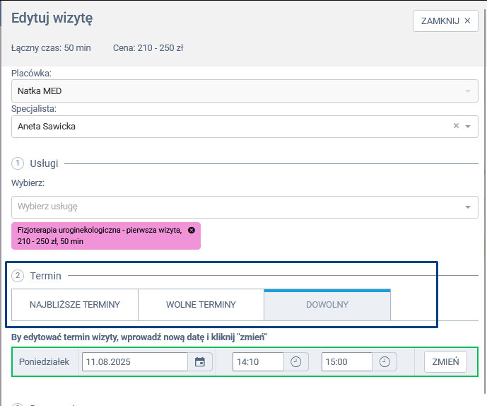 Po wybraniu nowego terminu wizyty w systemie, pojawi się dodatkowe okno z informacją o zmianie terminu. Masz wtedy do wyboru kilka opcji działania: